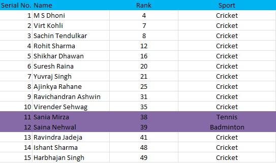 Meanwhile, tennis star Sania Mirza and badminton World No.2 Saina Nehwal are ranked 38th and 39th respectively. Incidentally, they are the only two female and non-cricket athletes to be listed within the top 50.