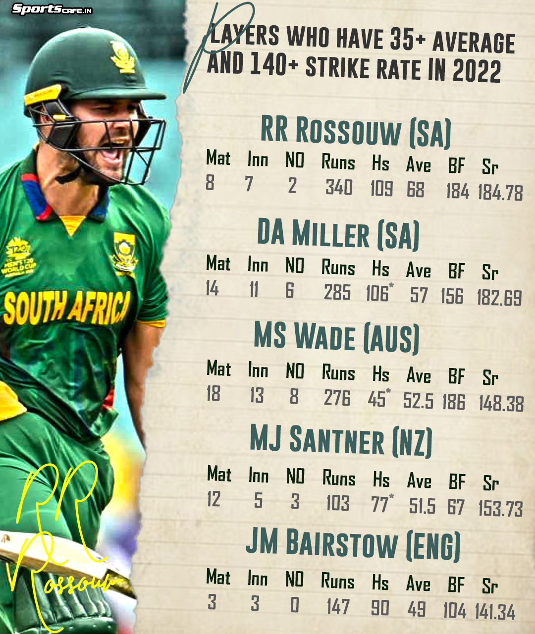 Rilee Rossouw's strike rate of 184 is the highest in 2022 among the players who have 35+ T20I averages © SportsCafe Graphic Team.Before CSA brought Rossouw into the fray, Rassie van der Dussen was South Africa’s preferred No. 3 in T20Is. Though van der Dussen’s overall numbers in this format are nowhere near as lofty as they are in the ODIs, he seems to be at the lowest point of his cricket career in 2022 before he broke his left index finger ahead of the World Cup. Before that, he could only manage one substantial contribution (46-ball 75 not out against India in Delhi) out of six T20I innings this year. Although that came in South Africa’s winning cause, his other knocks, including 7-ball 10 and 4-ball 14 against Ireland and 7-ball 1 and 4-ball 1 against India, made little difference to his side.